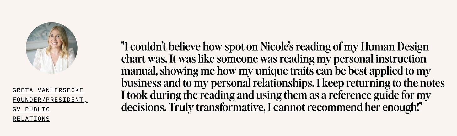 You’ll walk away with a comprehensive, done-for-you outline of your personal brand insights, based on your Human Design chart and my 20 years of experience in PR and marketing.